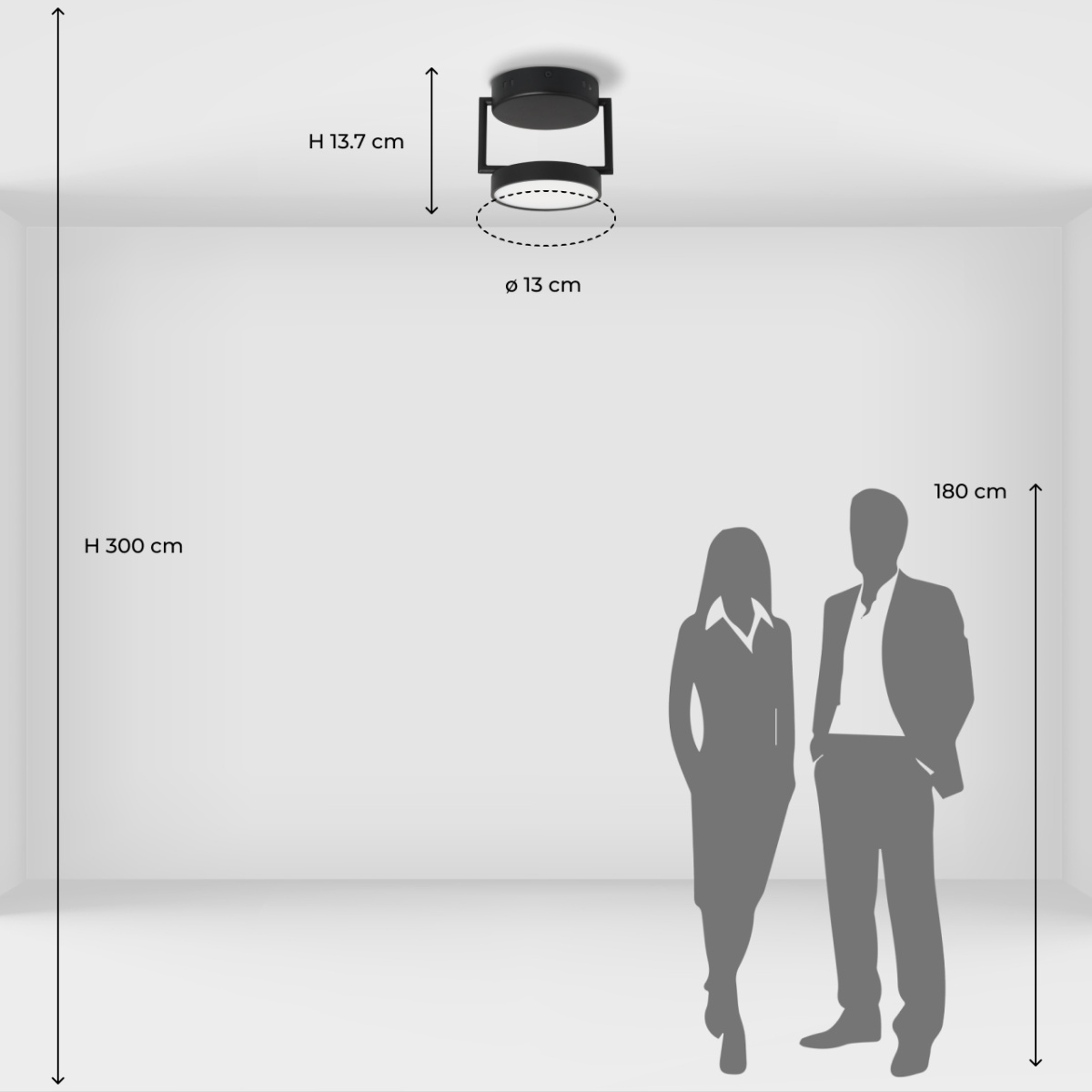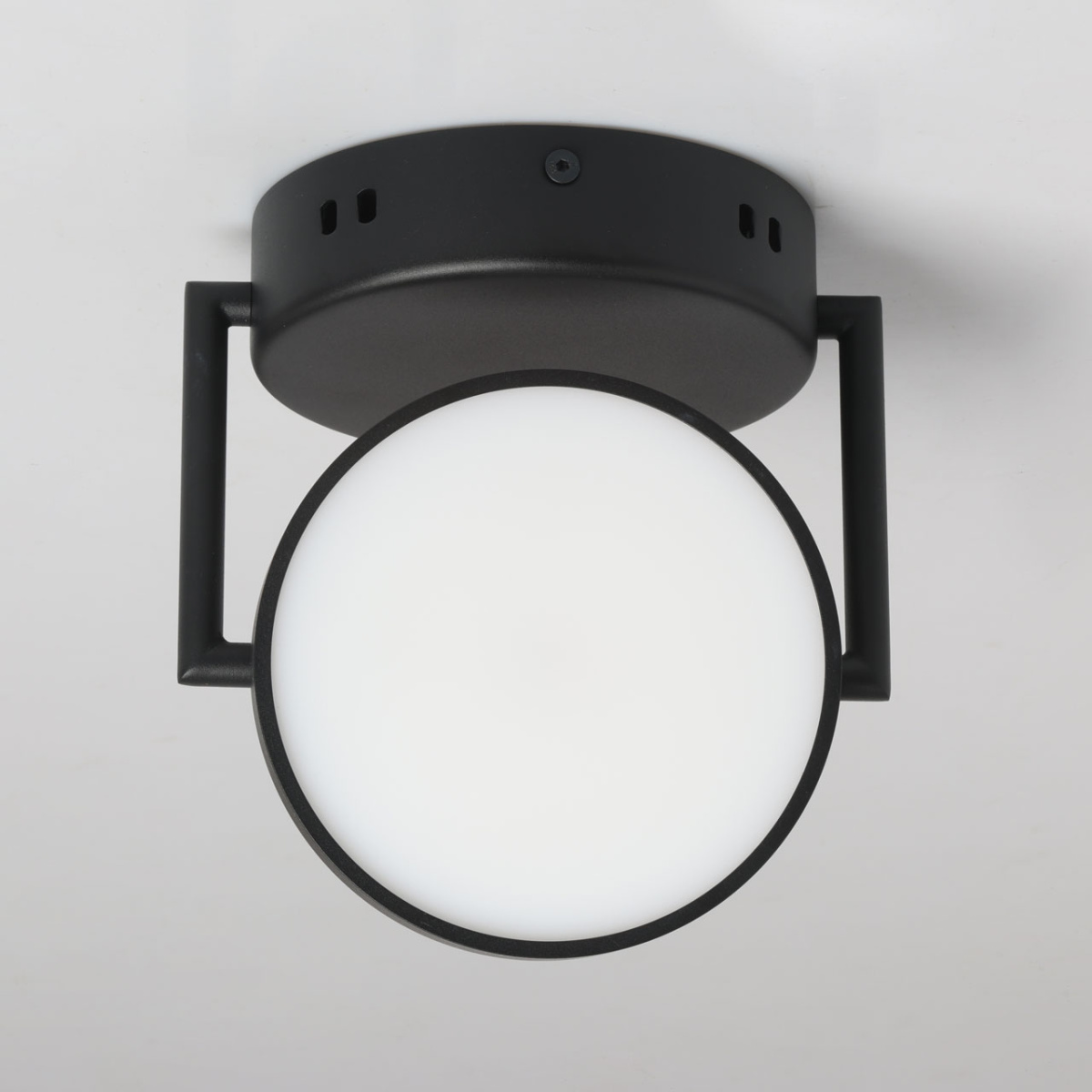 Металлическое основание потолочного светильника обработано по технологии порошкового окрашивания в черный цвет. Светодиодные источники света закрыты белым матовым акрилом.