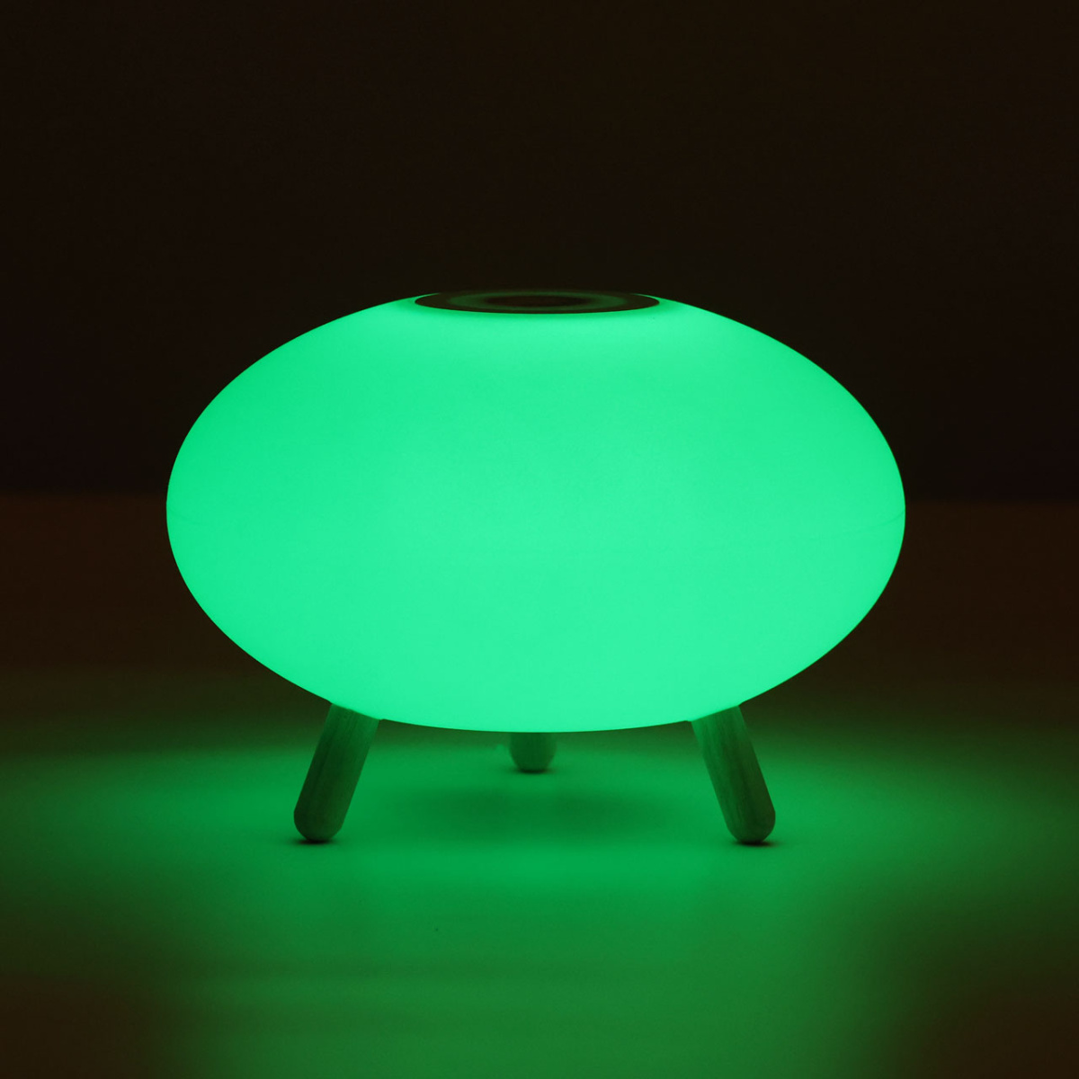 Светодиодный источник света белый, теплый+RGB закрыт белым матовым акрилом.Настольная лампа устанавливается на деревянные ножки цвета светлого дерева.Управление светильником расположены на корпусе плафона. Зарядный кабель USB входит в комплект.