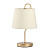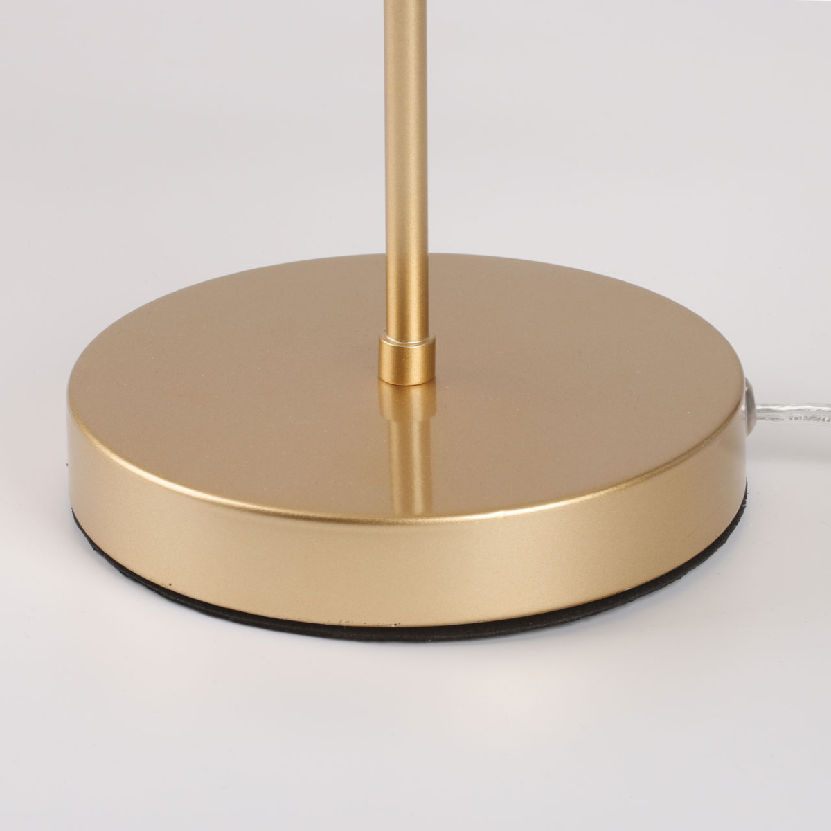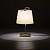 Металлическое основание настольной лампы окрашено в цвет перламутрового золота. Заменяемый источник света закрыт текстильным абажуром бежевого цвета. С внутренней стороны текстиль защищен прозрачным термостойким акрилом. Абажур отделан кантами и прошит.
