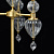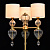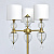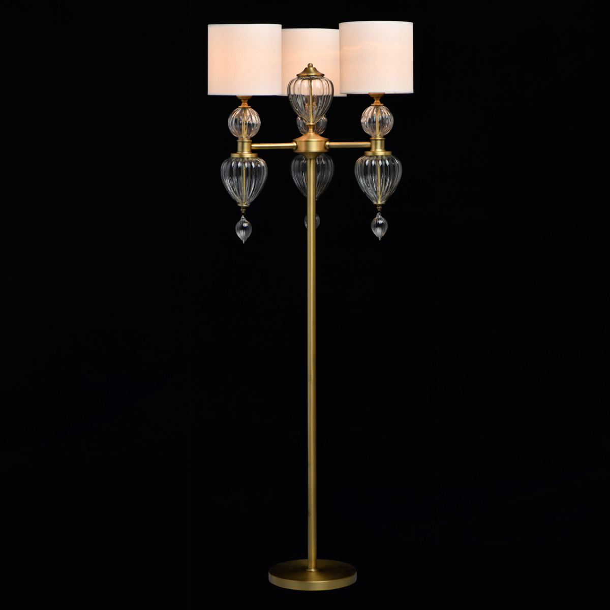 Основание светильника выполнено из металла и гальванизировано в цвет латуни. Светильник декорирован выдувным стеклом ручной работы. Текстильные абажуры белого цвета с термостойким акрилом внутри, отделаны кантом и прошиты.