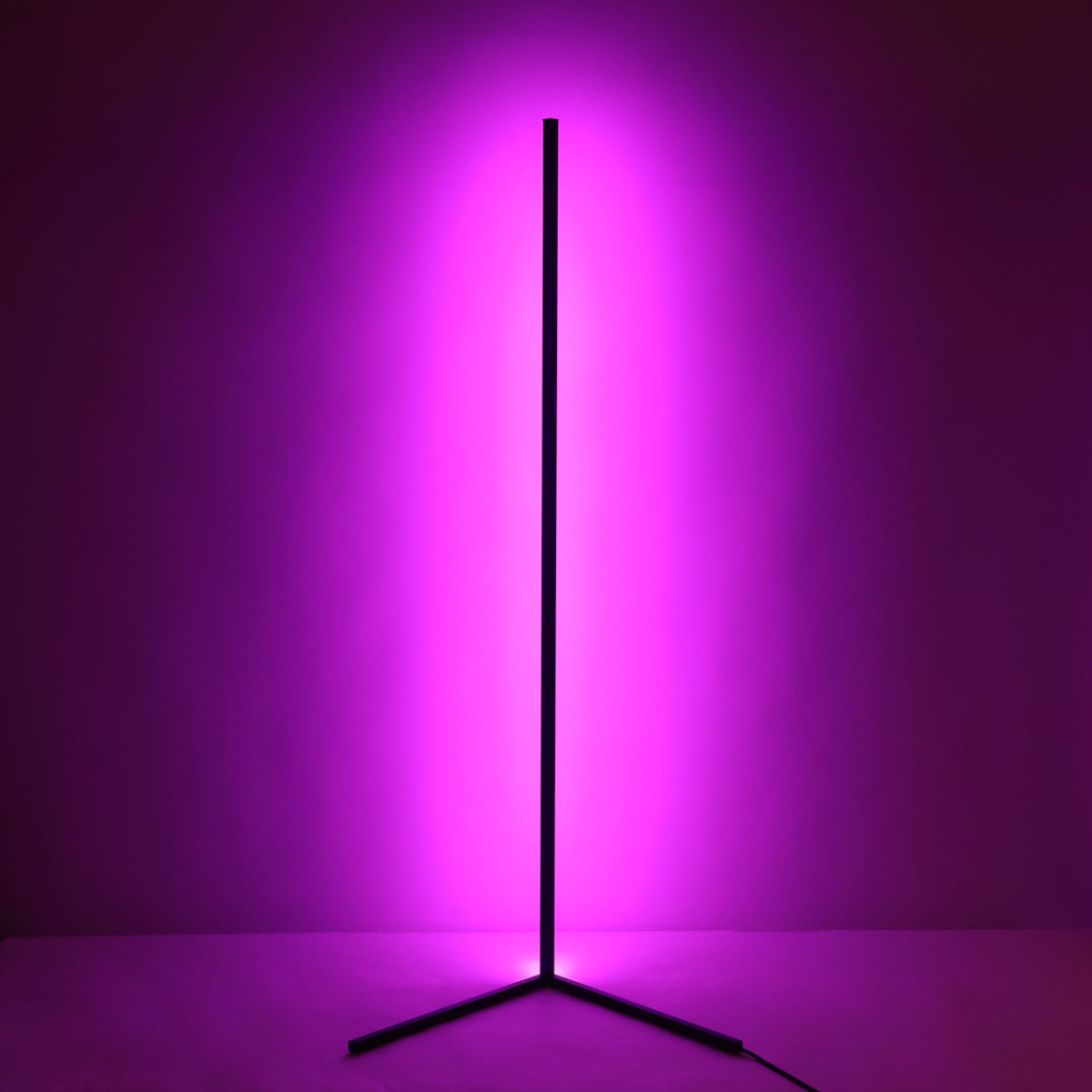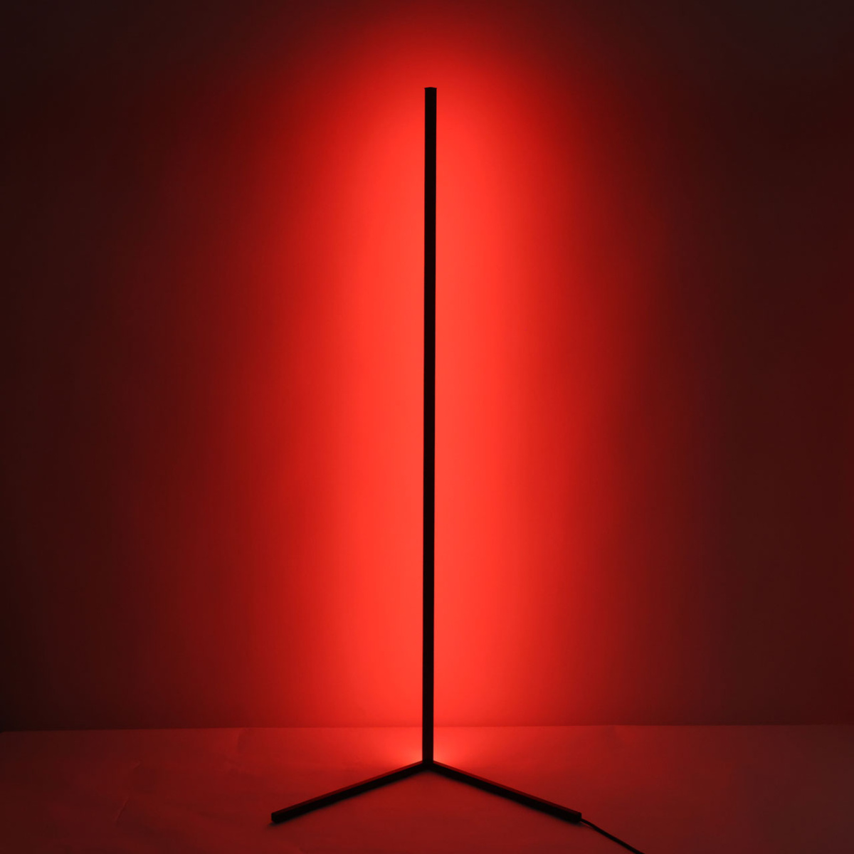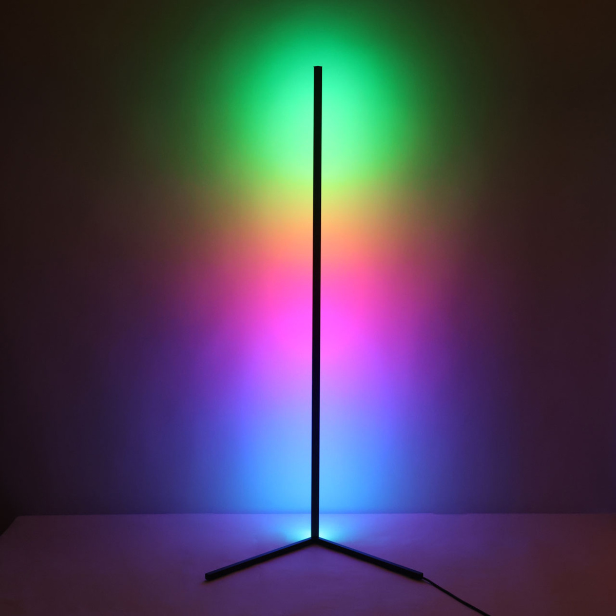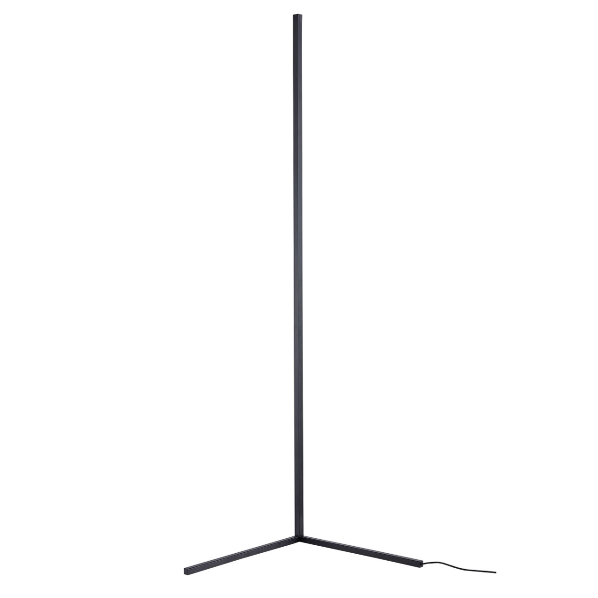 Металлическое основание торшера окрашено в черный цвет. Корпус плафона выполнен из сплава алюминия и окрашен в цвет основания. Светодиодный источник света RGB закрыт белым матовым акрилом. В комплект входит пульт.