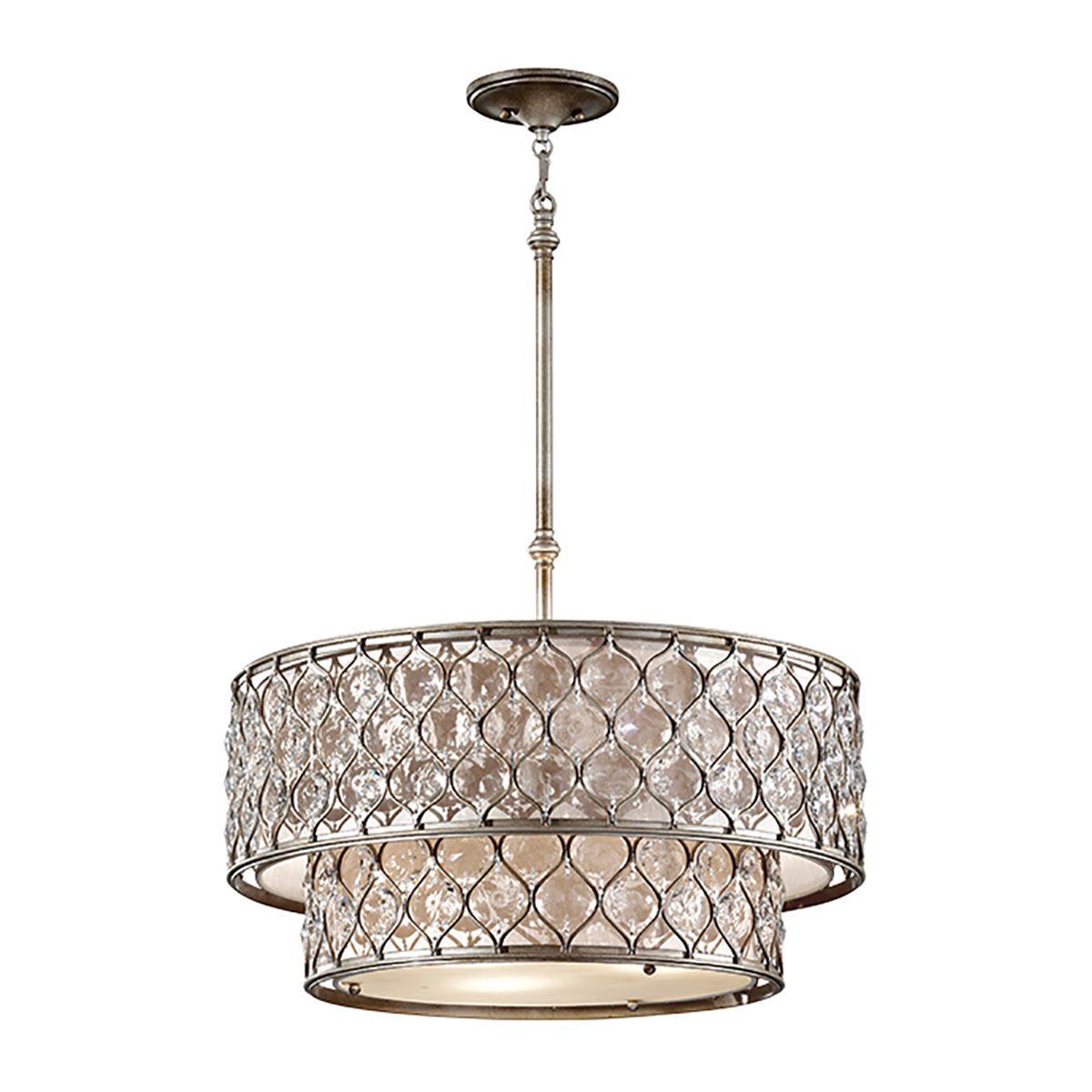 Люстра Elstead Lighting FE-LUCIA-P-E-2TR. Прекрасный светильник представляет собой многочисленные кристаллы огранки bauhinia (форма подсолнуха) в обрамлении металлического каркаса. Как только вы включаете эту лампу, она буквально оживает. Выполнен в современном стиле и одновременно ошеломляющем и многогранном дизайне. Светильник оснащен льняными абажурами и элегантными стеклянными рассеивателями, которые добавляют роскошь, но в то же время смягчает дизайн изделий. Основание выполнено в отделке - Сусальное серебро. Подходит для освещения гостинной, кухни, спальни, столовой. Стержни 4х300 мм и 2х150 мм в комплекте