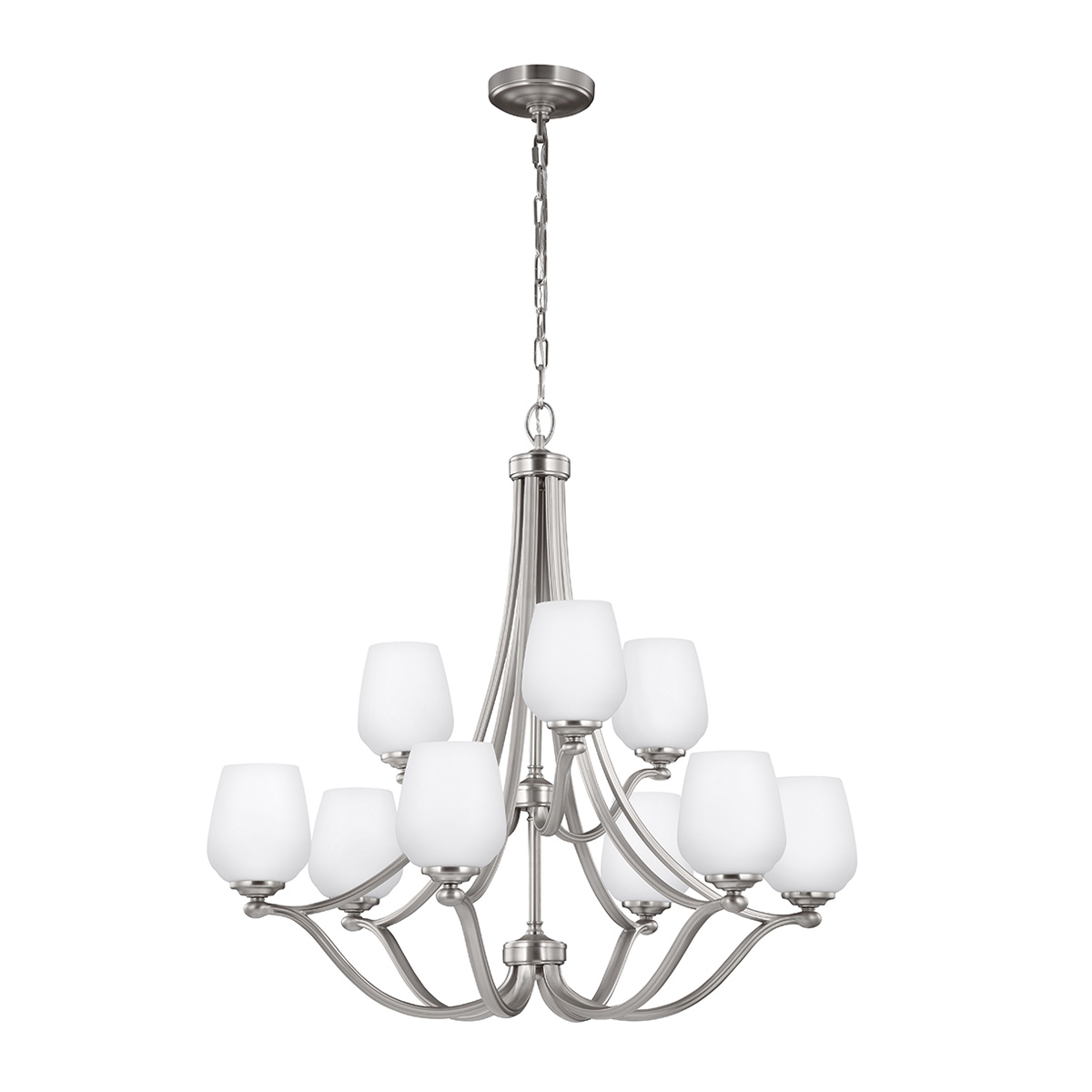 Люстра Elstead Lighting FE-VINTNER9. Плафоны из матового стекла напоминают форму винных бокалов. Плавные линии больших и малых держателей и декоративная круглая деталь под стеклянными плафонами создают простой изящный силуэт. . Основание в цвете - Никель. Можно использовать при освещении гостинной, кухни, спальни, столовой. Поставляется с цепью длиной 2134 мм