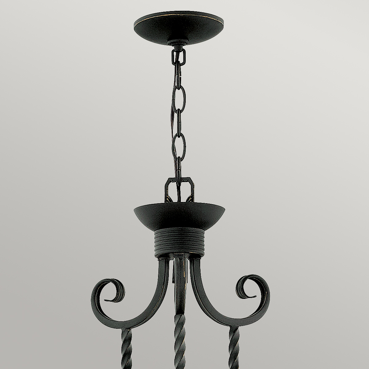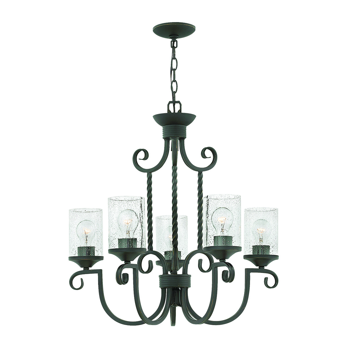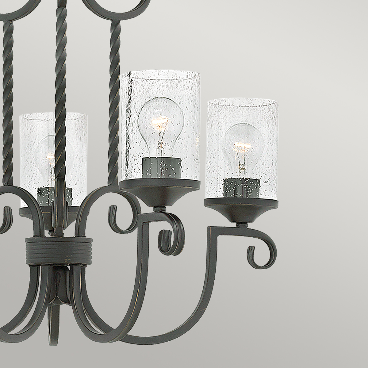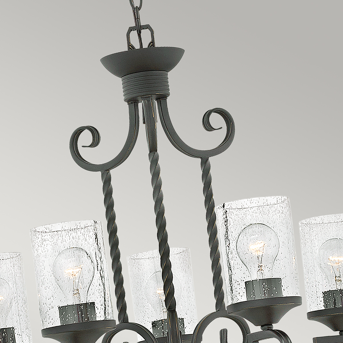 Люстра Elstead Lighting HK-CASA5. Стиль рустикальный шик. Витое кованое железо, орнамент в виде завитков ручной ковки. Прозрачное фактурное стекло. Основание выполнено в цвете - Черный. Подходит для освещения гостинной, кухни, спальни, столовой. Поставляется с цепью длиной 1524 мм