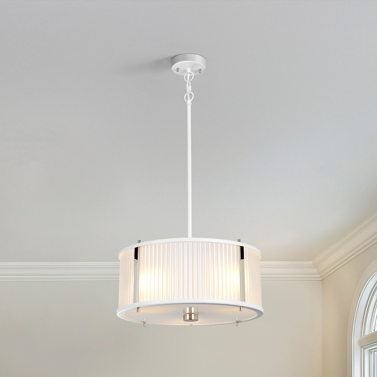 Подвесной светильник Elstead Lighting DL-CORONA-3P-WPN. Универсальный стеклянный светильник, который одинаково хорошо смотрятся как при потолочном креплении, так и при подвесном. Боковые матовые стеклянные панели слегка рассеивают свет, а большой диффузор из матового белого стекла создаёт под собой ярко освещённое пространство. Основание в цветах - Белый, Никель. Можно использовать при освещении гостинной, кабинета, кухни, прихожей, спальни, столовой. Поставляется со стержнями 2х305 мм, 2х152 мм и 1х75 мм