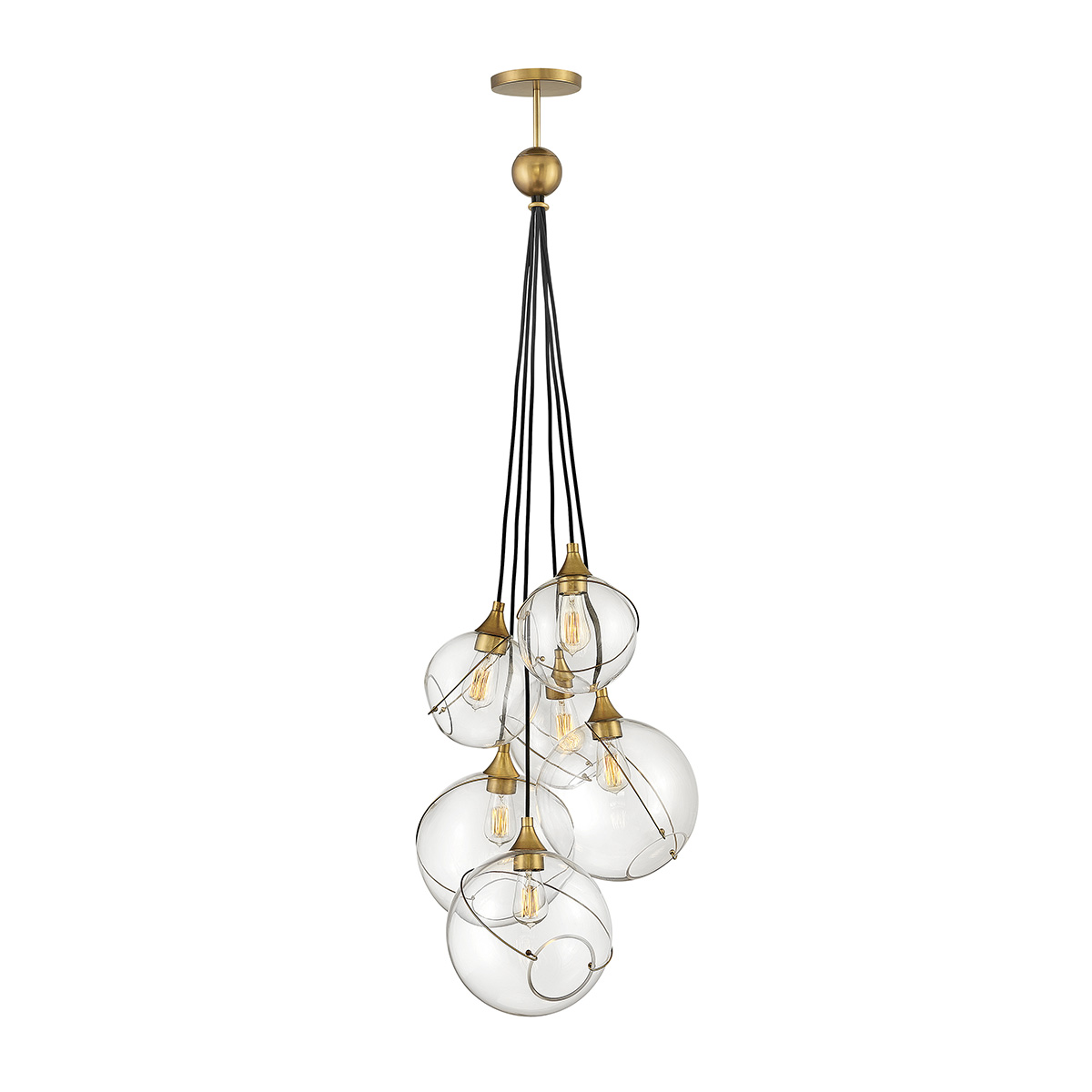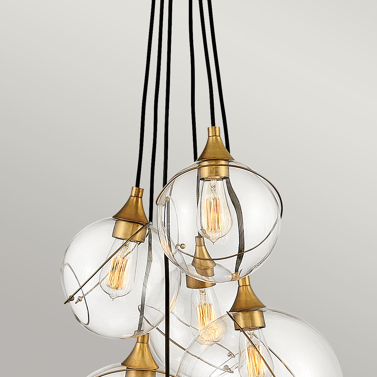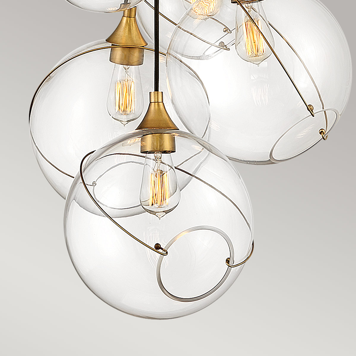 Подвесной светильник Elstead Lighting QN-SKYE-6P. Завораживающая асимметрия форм и явное влияние модерна середины хх века. Гроздь прозрачных шаров с отверстиями, опоясанных тонкими латунными кольцами. Отверстие в каждом шаре смещено от центра, шары подвешены на разной высоте. Детали отлично завершают комбинацию. Рекомендуем сочетать с индустриальными лампами. Внешний вид можно легко изменить, опуская или поднимая зажимное кольцо. Основание в цвете - Латунь. Можно использовать при освещении гостинной, кабинета, кухни, прихожей, спальни, столовой. Поставляется со стержнями 2х305 мм и 1х152 мм