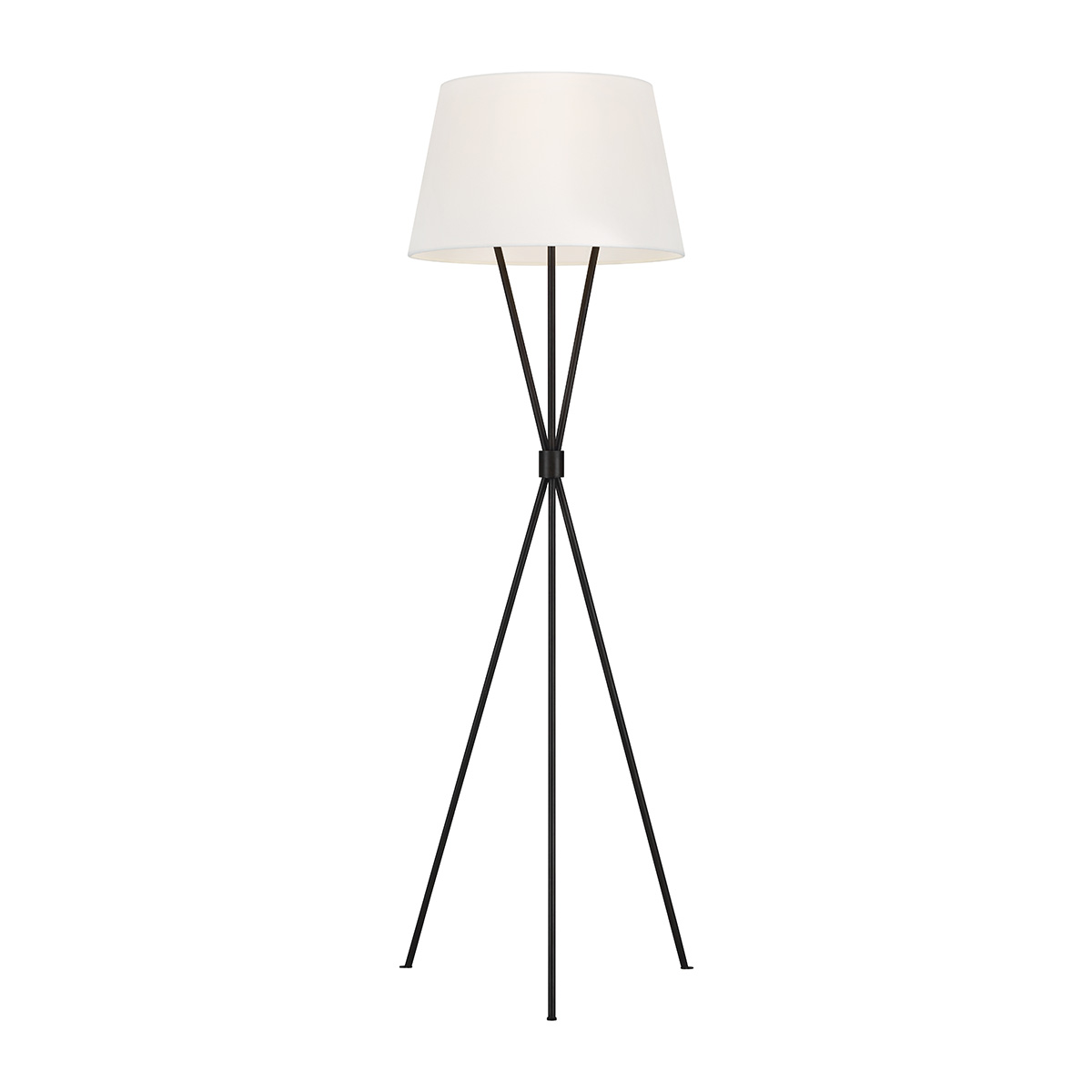 Основа-тренога в стиле середины ХХ века. Удлинённые ножки пересекаются в заданной точке. Абажур «белый лён». Покрытие «полированная латунь», «состаренное железо» и «полированный никель».