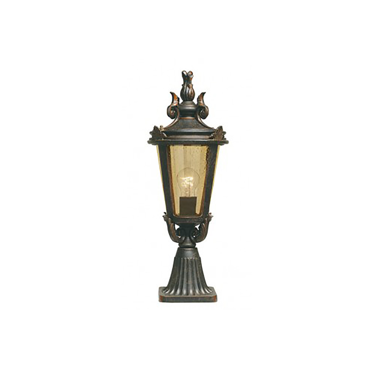 Фонарь пьедестал Elstead Lighting BT3-M из коллекции Baltimore. Светильник стилизованный под старину, с декором в виде листьев. Плафон выдувается из янтарного тонированного цельного стекла. Основание выполнено в цвете - Выветренная бронза. Можно использовать при уличном освещении, степень защиты IP44.