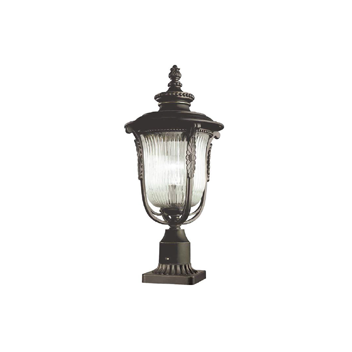 Фонарь пьедестал Elstead Lighting KL-LUVERNE3-M. Сочетание черной бронзы и рисунка в виде капелек, медальоны и завитки всё это делает светильник таким привлекательным. Компактно расположенные ребра на стекле создают очень комфортное для глаз освещение. Подходит для уличного освещения, степень защиты IP44.