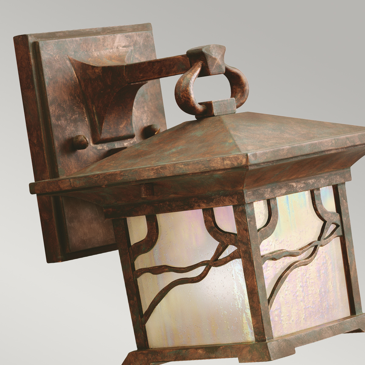 Настенный фонарь Elstead Lighting QN-MORRIS-S. Миссионерский стиль, распространённый на юго-западе америки колониальной эпохи. Искусственно состаренное медное покрытие. Фактурное матовое стекло. Алюминиевая конструкция. Подходит для уличного освещения, степень защиты IP44.
