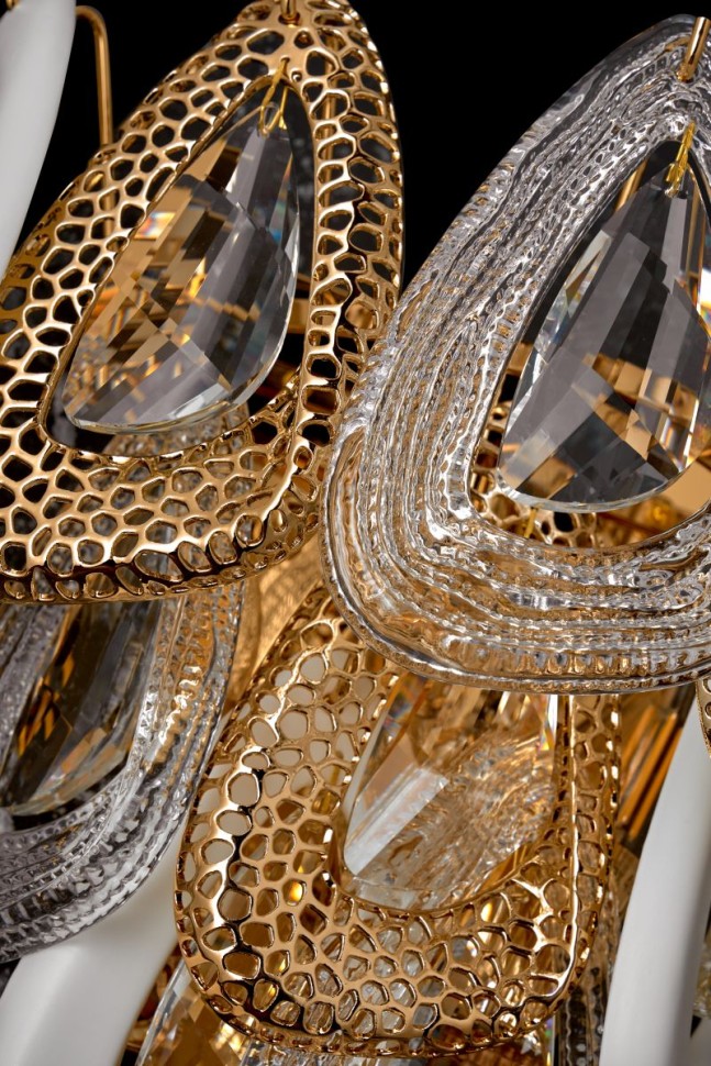 В переводе с итальянского название коллекции – «тонкость, изящество». Оно точно отражает утонченный характер дизайна светильников. Декоративные элементы плафонов выполнены в виде крупных капель из керамики и хрусталя высшего качества. Вместе они создают гармоничную элегантную композицию. Арматура светильников – из металла с гальваническим покрытием золотого цвета. Коллекция представлена люстрами различных размеров и форм и настенным светильником.