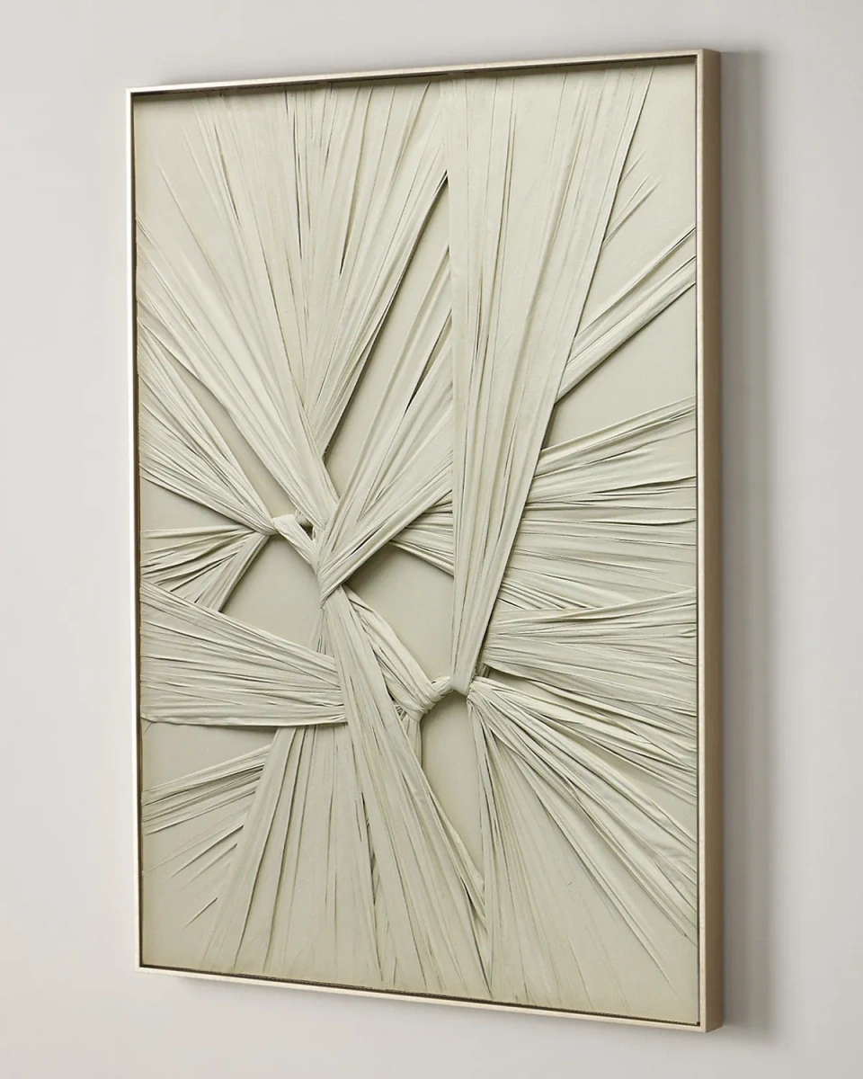 Интерьерное панно "Bonds" - это произведение выполненное в технике текстильного и рельефного арта. Его основа — натянутая на подрамник ткань светлого оттенка, с добавлением гипсовой текстуры. Полотно оформлено в виде множества перекрученных и натянутых лент, создающих динамичный, почти скульптурный узор с множеством складок и пересечений. Композиция выглядит абстрактно, но при этом гармонично, благодаря приглушённой монохромной палитре и четким линиям. Такое панно станет акцентным элементом в современном интерьере, особенно в минималистичном или скандинавском стиле.