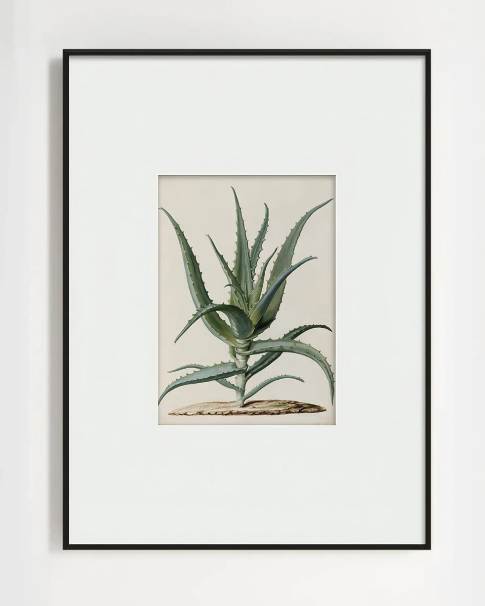 Интерьерный постер “Аloe” – это репродукция картины написанная акварелью в 1867 г. голландской художницей-ботаником [su_tooltip title="Мария Монинкс (Maria Moninckx)" text="Мария Монинкс (1673 г. - 1757 г.) - художница, известная благодаря своему цветному девятитомному ботаническому атласу, который она создала вместе с отцом." background="#424242" color="#ffffff" font_size="12"]Марией Монинкс[/su_tooltip]. Получив заказ на 420 акварелей с изображениями растений, Монинкс создала монументальную работу, которая до сих пор вызывает интерес у таксономистов, исследователей и ценителей искусства. Размеры этого интерьерного жикле позволяют легко вписать его в различные пространства вашего дома или офиса. Он может служить прекрасным украшением для стен в гостиной, спальне, кабинете или в обеденной зоне, добавляя ноту ботанической эстетики и стиля.