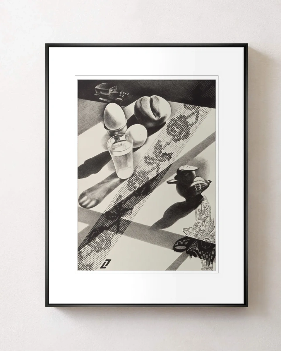 Интерьерный постер "Breakfast" – это репродукция одной из картины [su_tooltip title="Луи Лузовик" text="Американский художник и гравер украинского происхождения. Он известен как художник в стиле ар-деко и прецизионист, и в основном создавал обтекаемые монохромные литографии в урбанистическом стиле за свою карьеру, которая длилась 50 лет." background="#424242" color="#ffffff" font_size="12"]Луи Лозовика[/su_tooltip], которая является синтезом различных стилей раннего модерна: кубизма, прецизионизма и даже сюрреализма. "Breakfast" - это высший пример таланта Лозовика в области тональной литографии. Картина "Breakfast" изображает различные предметы, связанные с завтраком, такие как два яйца, булочка и стакан с прозрачной жидкостью. Они расставлены на сильно наклоненной столешнице, создавая необычную и динамичную композицию. По диагонали композиции проходит лента ткани, которая выглядит как узор для вышитой каймы. Можно предположить, что это рисунок на скатерти, и хотя она выходит за край стола, создает иллюзию глубины и движения. На картине также присутствуют другие интересные детали, такие как игрушечный цыпленок и стилизованный цветочный узор, прорастающий из корзины. Они добавляют элементы игры и природы в композицию, создавая интересный контраст с жестким геометрическим рисунком и растительным орнаментом. Глубокие тени, брошенные объектами, создают дополнительную глубину и объем, контрастируя с плоскими геометрическими и растительными элементами. Этот контраст придает картине особую энергию и динамику. Интерьерный постер "Breakfast" - это не только потрясающий художественный объект, но и отличное дополнение к любому интерьеру. Его яркие цвета, необычная композиция и уникальная комбинация стилей сделают его прекрасным украшением для гостиной, спальни или офиса. Он подойдет как для современного, так и для классического интерьера, придавая ему особый стиль и характер.