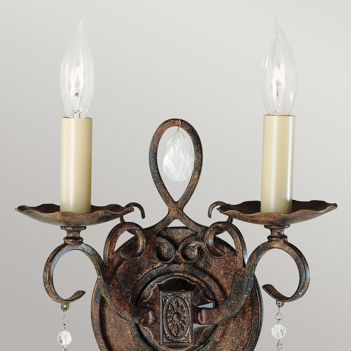 Бра Elstead Lighting FE-CHATEAU2. Вдохновлено архитектурой великих замков на юге франции. Завитки из трубочек квадратного сечения создают лирическое настроение и гармонируют друг с другом. Подвески из оптического стекла. Основание выполнено в отделке - Бронза. Идеально подойдет для освещения гостинной, кабинета, кухни, прихожей, спальни, столовой.