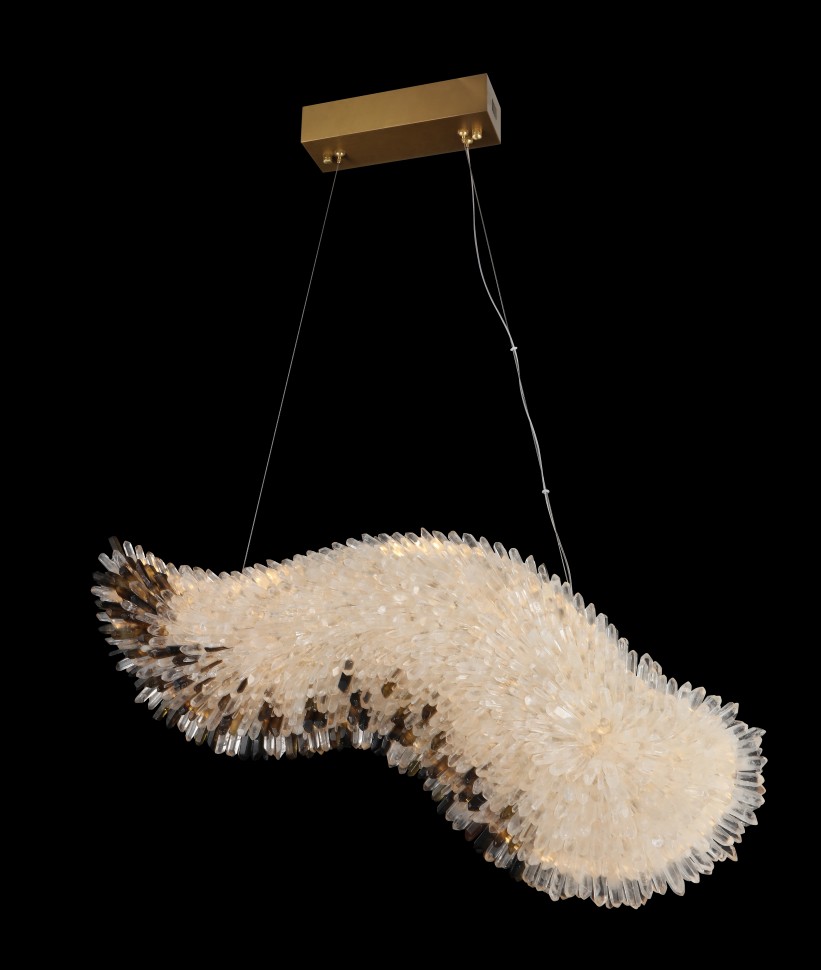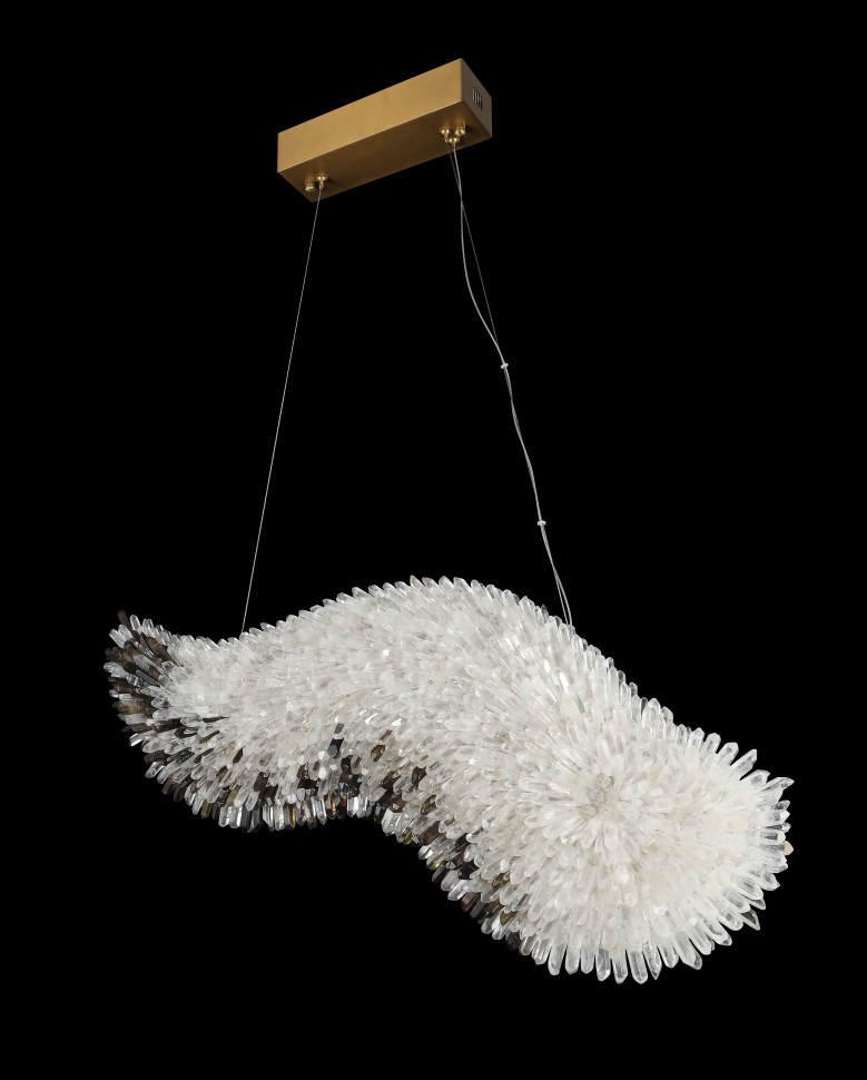 Выполненная из натурального горного хрусталя, она покоряет плавными линиями и естественным, чарующим блеском природных камней. Волнообразная форма и россыпь кристаллов порождают ассоциации с крылом парящего ангела. Переливающиеся кристаллы горного хрусталя создают изысканную игру теней и бликов, подчёркивая динамику формы.