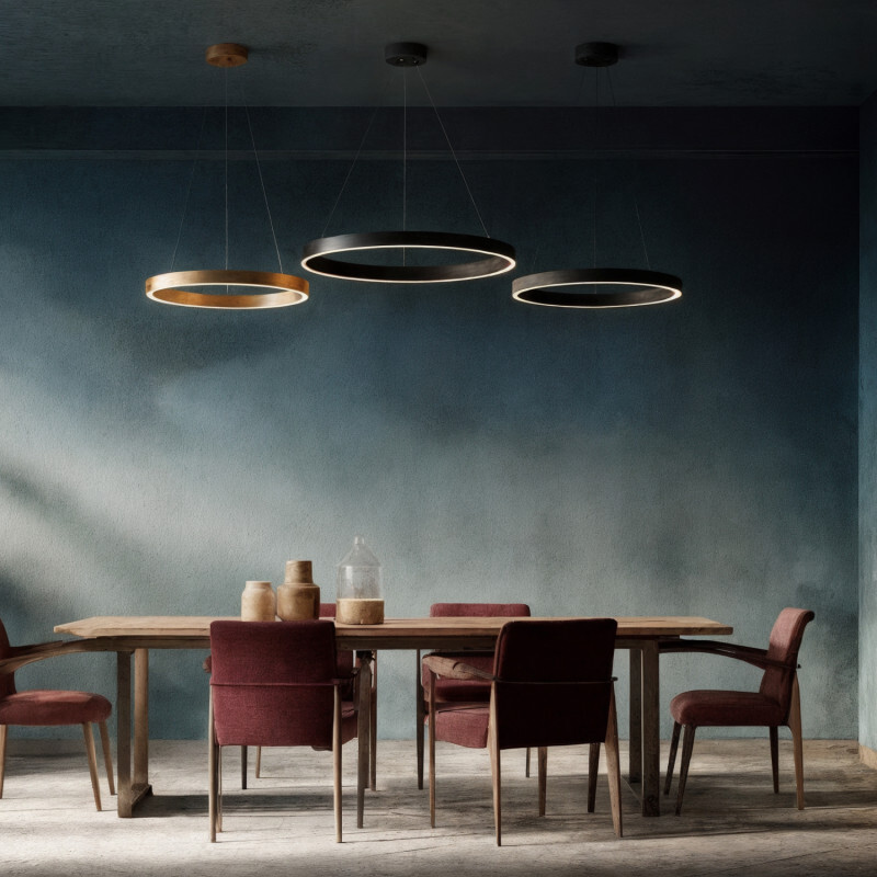 RAYDIA — коллекция подвесных светильников с уникальным кольцевым дизайном, создающих мягкое равномерное освещение в двух направлениях: вверх и вниз. Элегантный дизайн делает их стильным акцентом в любом пространстве. Металлический корпус с акриловым рассеивателем. CRI ? 80 для естественного восприятия оттенков. Регулировка цветовой температуры 3000К–4000К. Угол рассеивания 120° для комфортного общего света. Доступны два размера: 600 и 800 мм. Цветовые решения: черный и матовое золото.Идеально для гостиных, обеденных зон, переговорных и общественных пространств. Коллекция сочетает в себе функциональность и декоративность, создавая гармоничное освещение и подчёркивая архитектурные особенности интерьера.