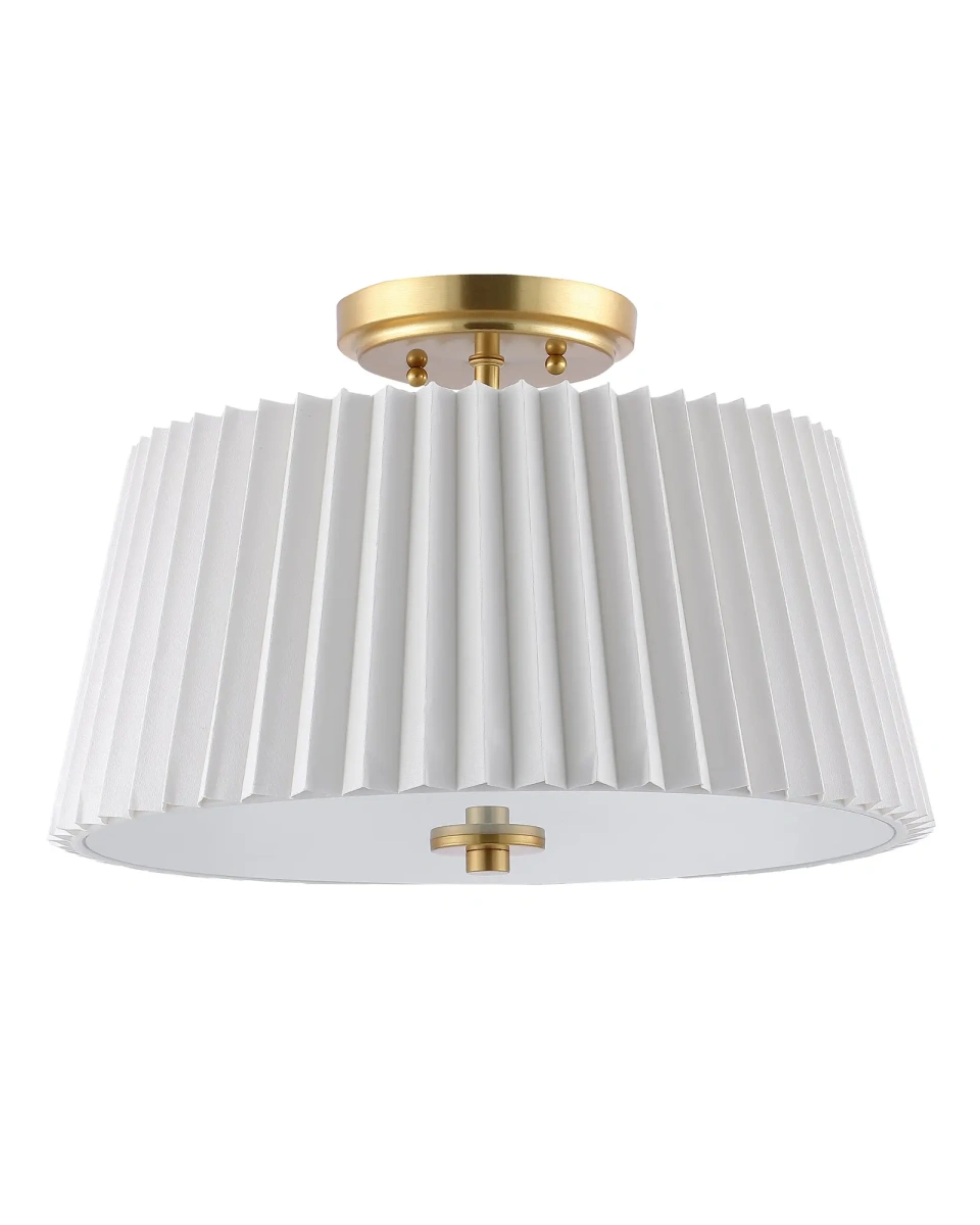 Главной особенностью светильника "Димпл" является его белый плиссированный абажур из ткани. Этот абажур придает лампе игривый и нежный вид, создавая приятную и мягкую атмосферу в помещении. Плиссировка ткани добавляет светильнику объемности и интересности, делая его истинным центром внимания в комнате. Дополнительной особенностью светильника является его металлические акцентные детали, выполненные в цветовой гамме латунь. Он будет отлично сочетается с другими элементами декора и мебели, создавая гармоничное и уютное пространство. Благодаря своим размерам и форме, он легко впишется в любое помещение, будь то гостиная, спальня или кабинет. Потолочный светильник "Димпл" станет прекрасным дополнением к любому интерьеру.  сочетающее в себе элегантность и современность!